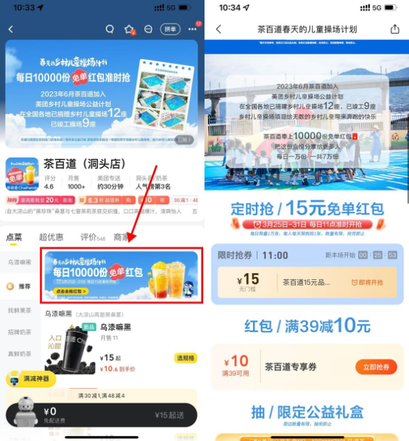 美团APP搜索“茶百道”->随便点家店进入->再点横幅进入,3月25日~31日每天11点抢1万份15元无门槛券