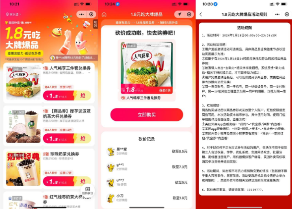 微信打开地址->选择自己想要的邀请4人助力->完成后即可1.8亓买券,这是外卖配送的 不是到店券
