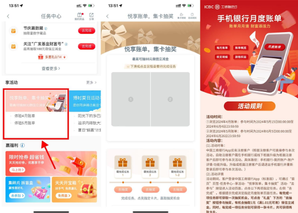 工行APP搜索“任务中心”->悦享账单集卡抽奖->简单浏览得次数抽立减金