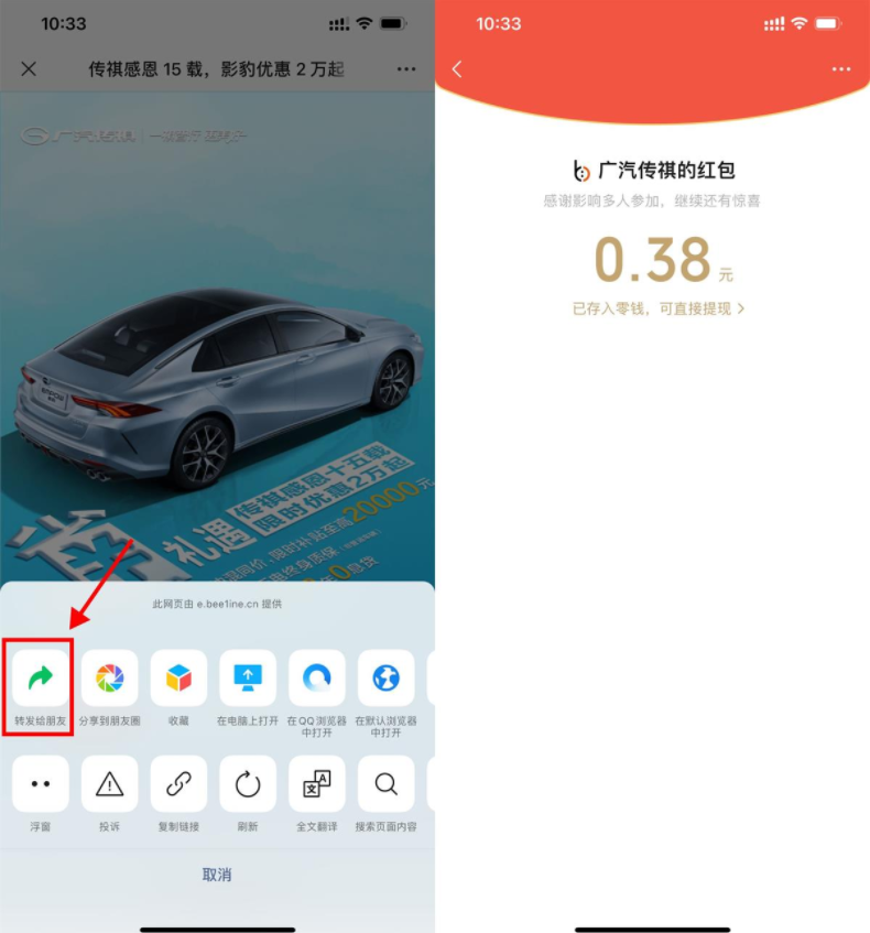 微信打开地址->分享给小号->小号点击进入->自动推送红包给大号