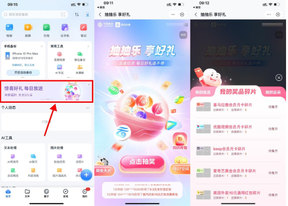 移动云盘APP->首页横幅“惊喜好礼 每日放送”->抽支付宝红包、微信立减金、视频会员等