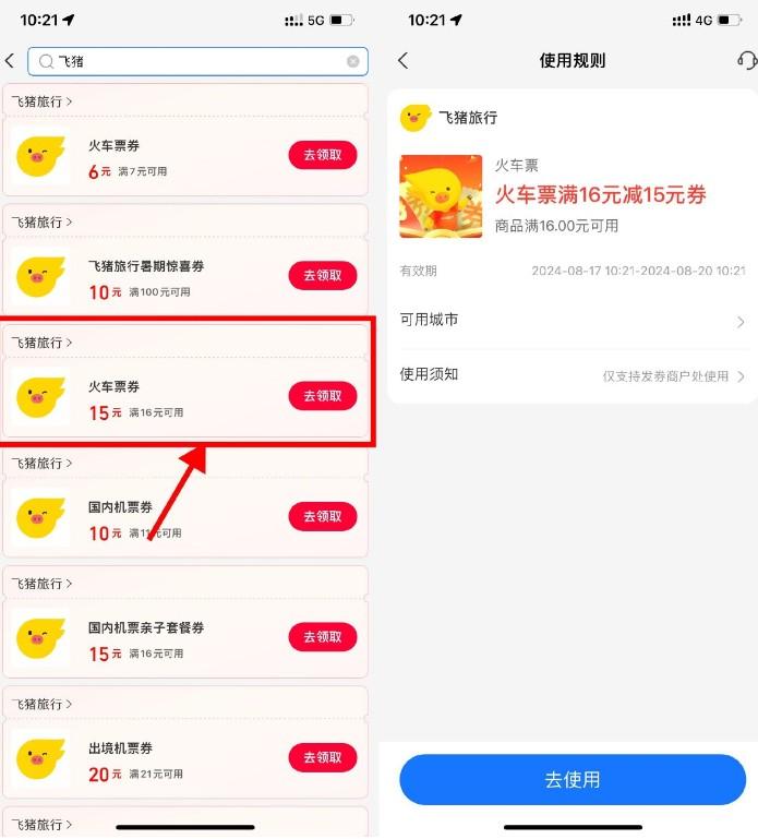 支付宝搜索“消费券”->进入再搜索“飞猪”->直接领16-15亓火车票券,在飞猪APP买火车票即可抵扣