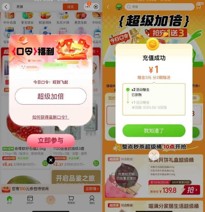 淘宝首页“天猫超市”->右下角惊喜口令输入“超级加倍”->今天有充1送3亓猫超卡,限量5万份先到先得