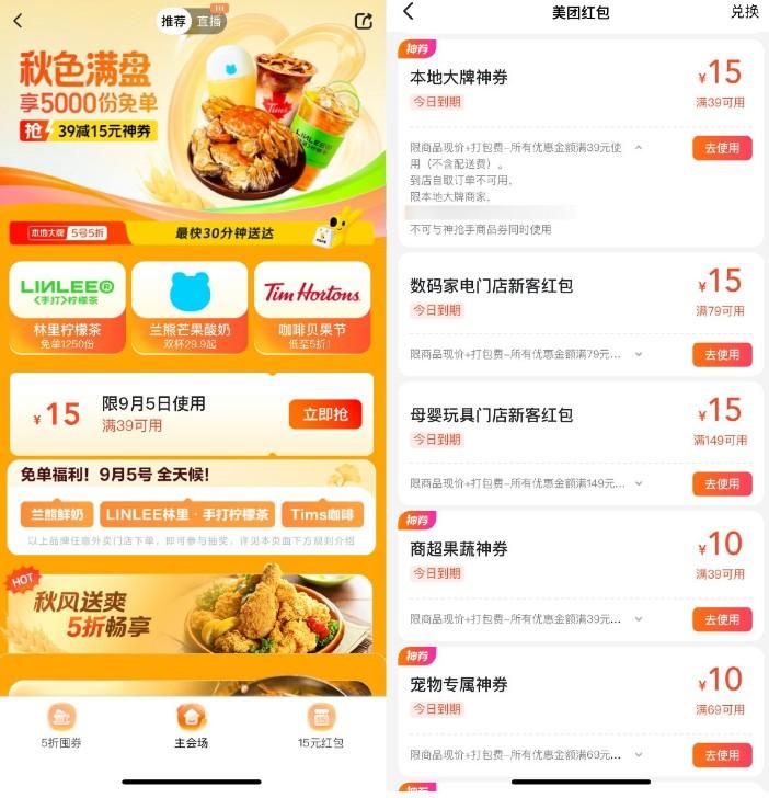 美团APP搜索“5号5折”->领36减15元外卖券,券仅限今天9月5日使用