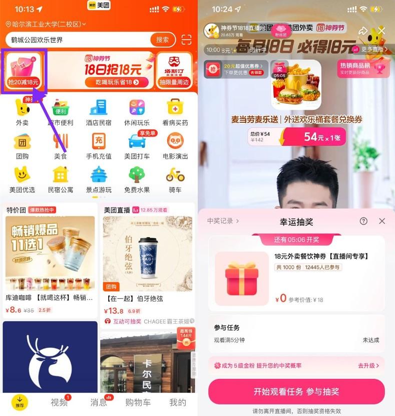 美团APP首页直播间->进入左上角福袋->每20分钟抽1000张20减18元外卖红包