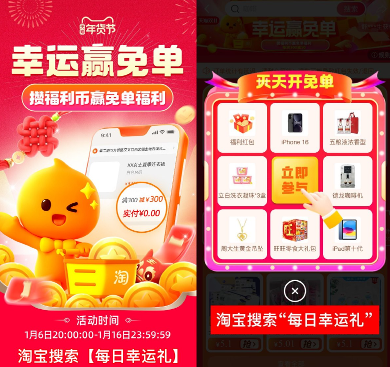淘宝搜索【每日幸运礼】每天进入可抽红包或实物!攒福利币最高得300亓免单!