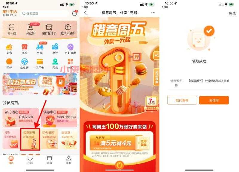 新一期!建行生活APP首页“橙意周五”->进入领取满5减4元外卖券,可叠加饿了么红包使用,刚好要点外卖的可以领下!