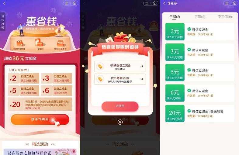 建行APP搜索“惠省钱”->部分人会弹出折扣券->抽取购买价格(大于8亓建议别买,部分人有限时道具可以立减)->购买后在微信卡包中查看