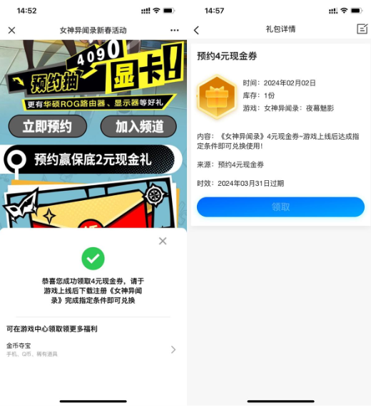 QQ打开地址->预约游戏领4亓红包卡券,卡券需等游戏上线后才可兑换