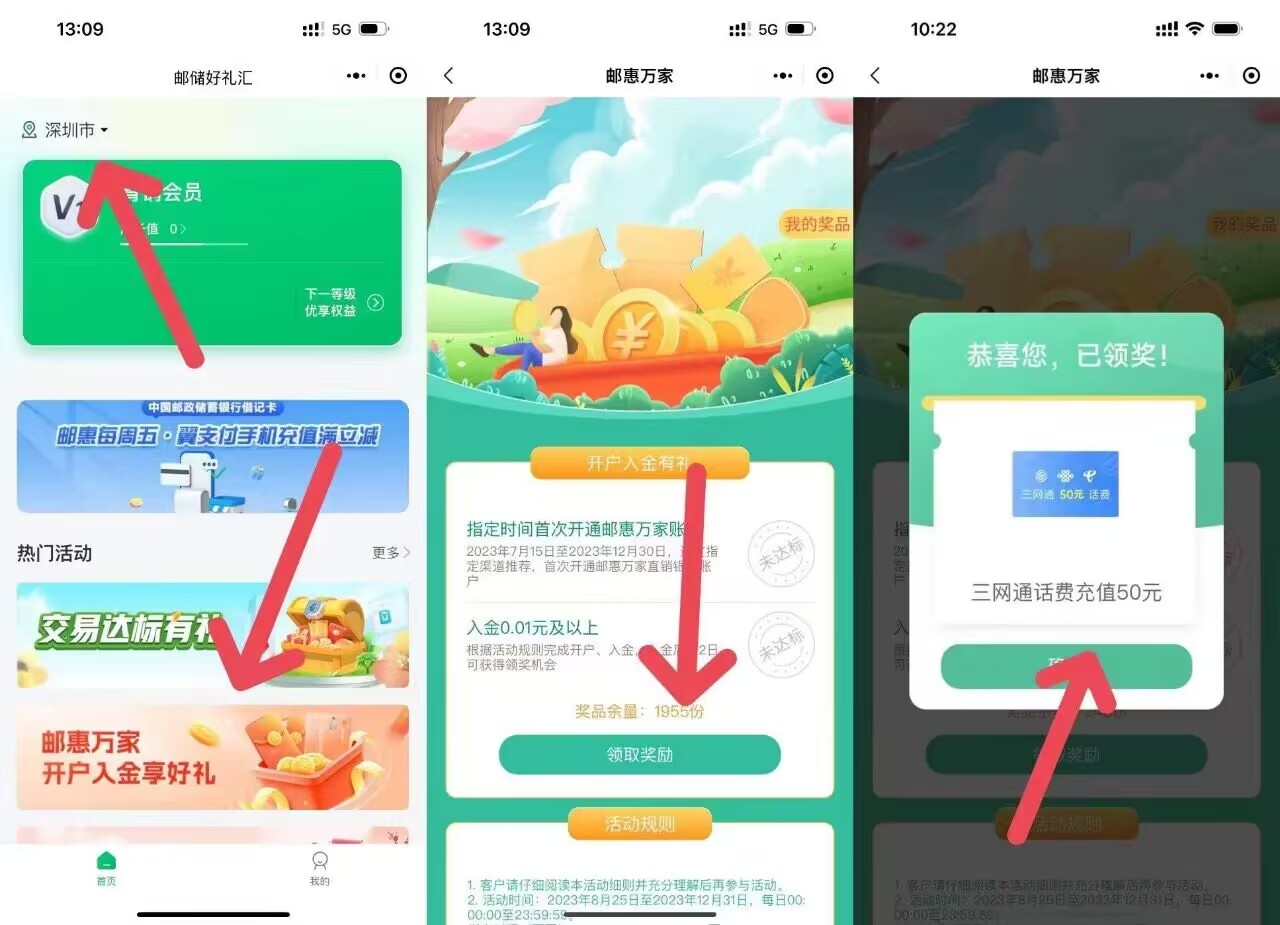 第二天微信搜索小程序:邮储好礼汇->定位改深圳->点击开户进入金好礼->抽50话费亲测早点去!