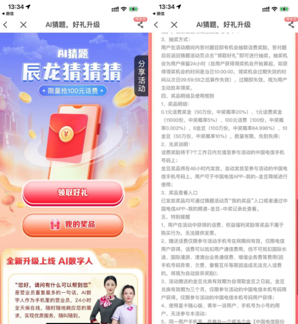 电信APP搜索“有奖猜题”->答对后直接抽0.1~100亓话费或金豆,每天均可参与