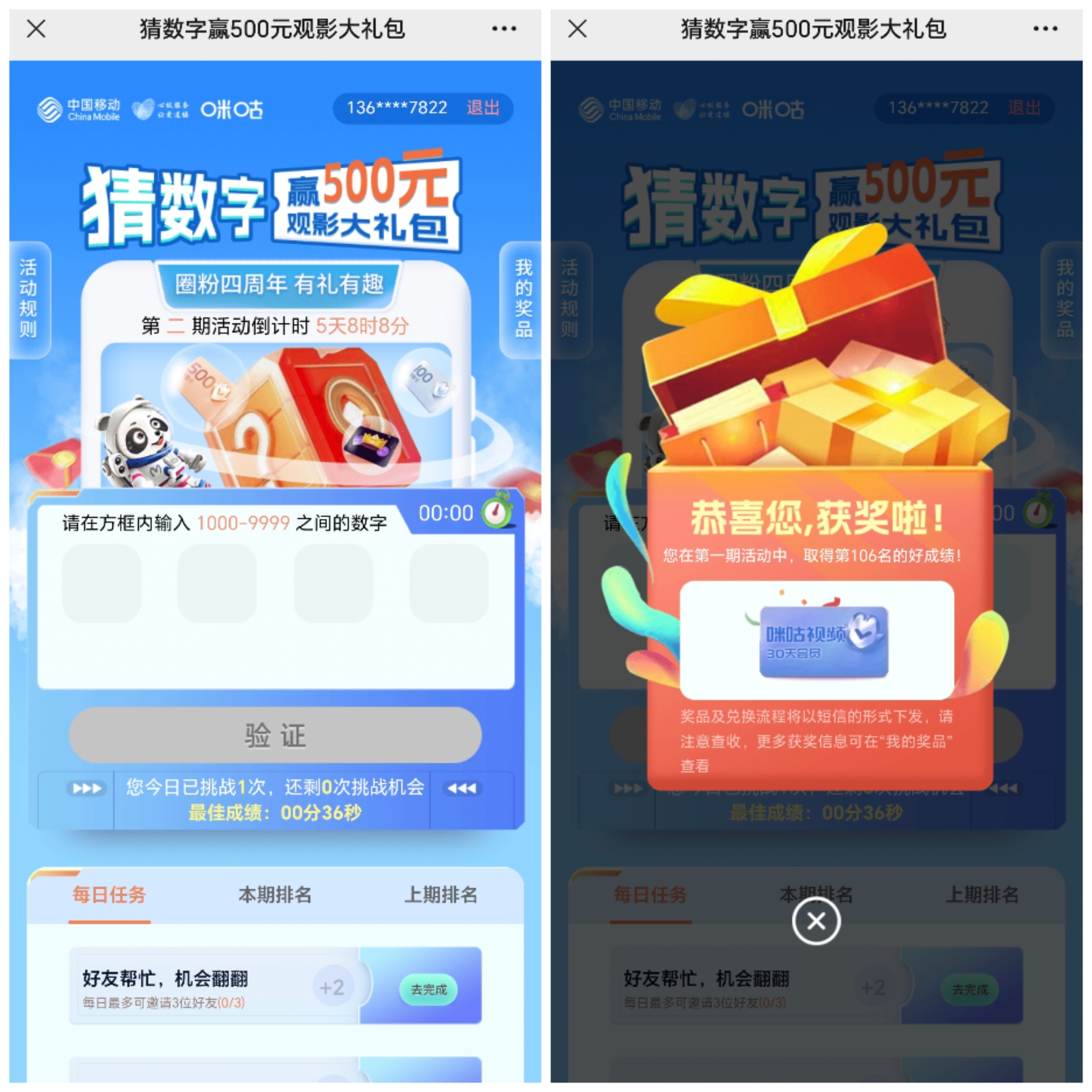 打开地址->登陆账号->首页四个方框中输入4位数字->点击“验证”->猜中的时间越短越好,第一名500元电影卡,第二名200元电影卡,第三名100元电影卡,第4-10名50元电影卡,第11-500名咪咕视频30天会员