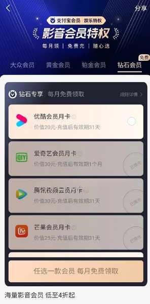 支付宝钻石会员每月免费领优酷VIP月卡,只要等级够的赶紧去,不要白不要,如果是优酷会员领不了。