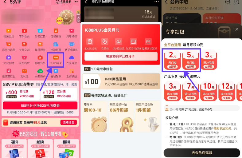 1、淘宝搜索“会员中心”->右划领取1688PLUS会员月卡->再去阿里巴巴APP会员中心领2+5亓红包
