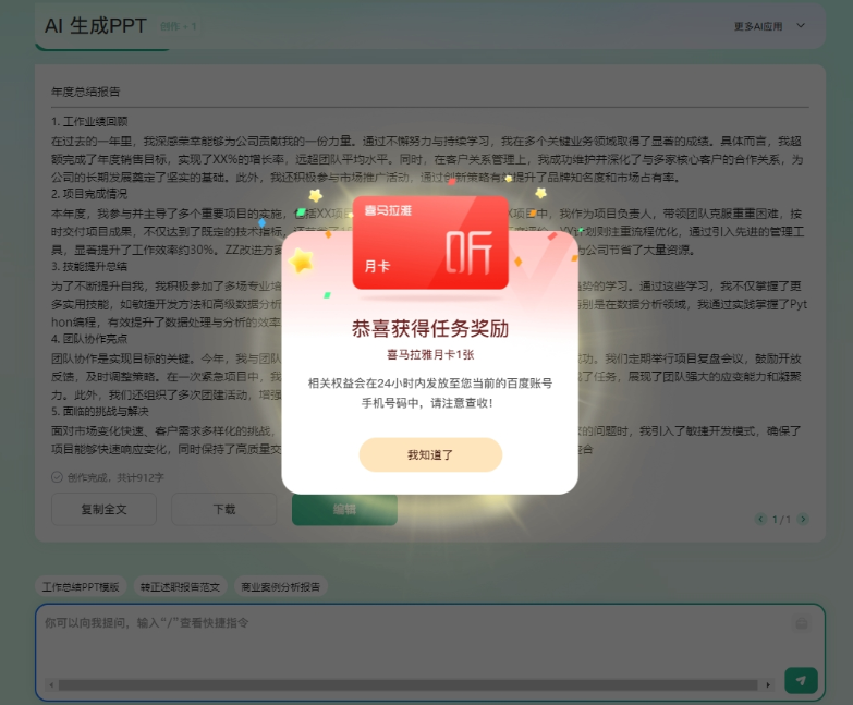 电脑打开活动->对话框右上角参与->随便提两个问题直接领百度文库月卡+喜马拉雅月卡,限量1万份先到先得