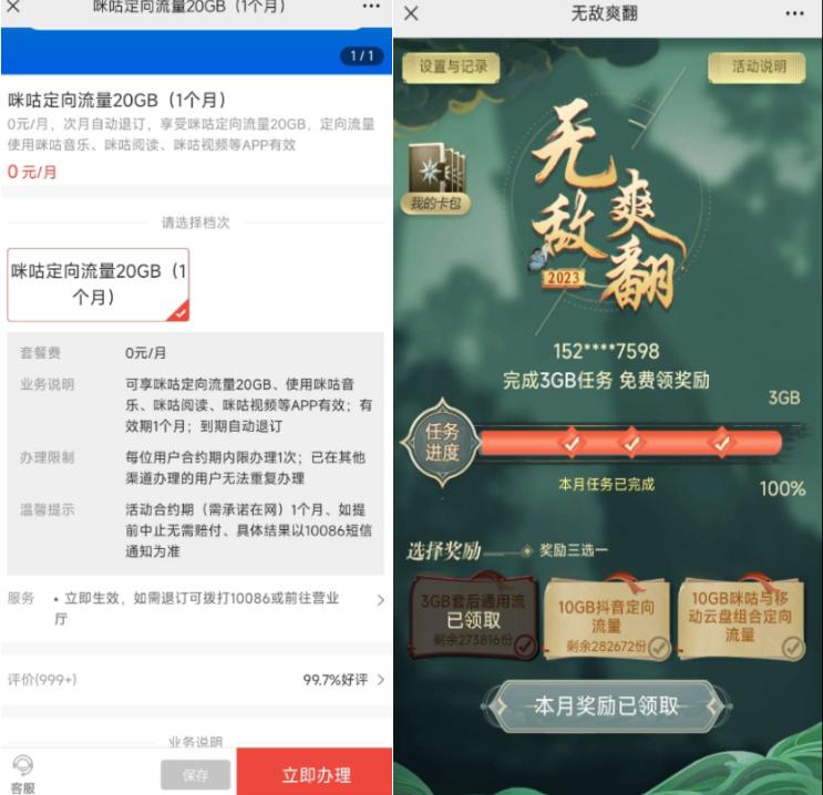 先进移动营业厅APP 0元20g流量,狼参加无敌爽翻天任务领取最高的