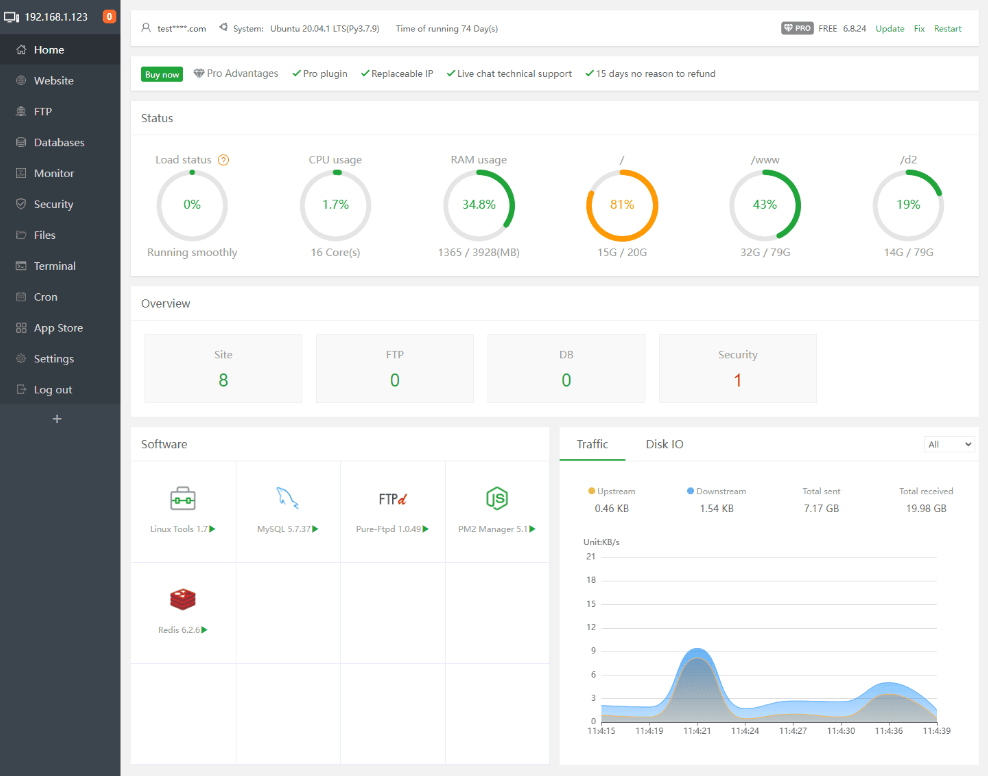 很多人都知道宝塔面板,但不知道宝塔面板还有英文版,宝塔面板英文版不是单纯的宝塔面板的翻译,而是根据老外的使用习惯及国外的网络环境做了一定的优化,比如:去掉了手机号验证、去掉了国内网盘的存储、镜像下载国外加速。 我已经用了很久了,感觉宝塔面板英文版是中文的精简、简洁版,功能方面与中文宝塔面板无疑。