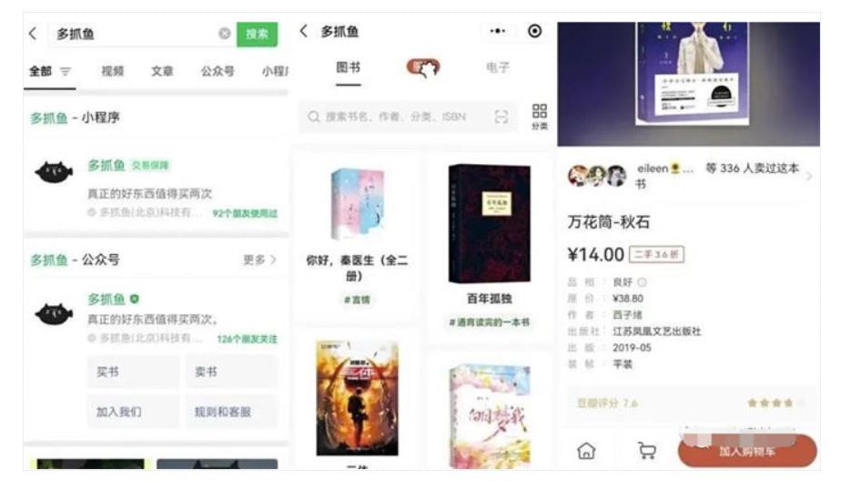 我们要了解上家背景,货从哪里来,从哪里来。买书需要先注册一个多鱼账号。它在微信上只有微信官方账号和小程序,即一个微信可以注册一个账号,点击“买书”并选择要购买的书籍添加到购物车中。当我们想要的书缺货时,我们需要点击“到货提醒”。