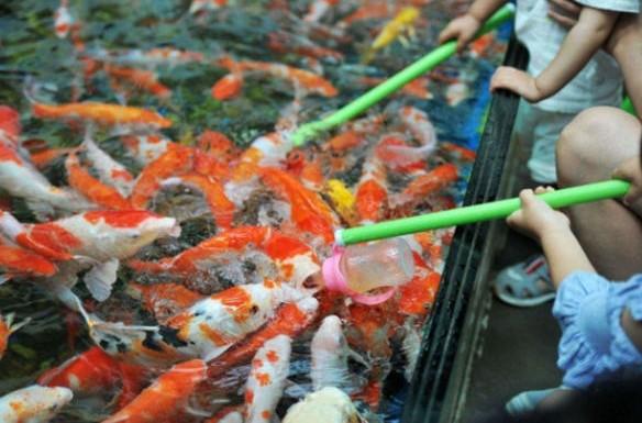 只见一堆四五六岁,八九岁的小孩子,还有很多成年人,围坐在一起,手里都拿着一根钓鱼竿一样的东西,伸进水里,貌似水里还有鱼在游动,红彤彤的一片。我以为是钓鱼游戏,但走进仔细一看,并不是钓鱼,他们在喂鱼,棍子上竟然绑了一个奶瓶,一堆硕大个的红色鲤鱼正在吸吮他们的奶瓶。