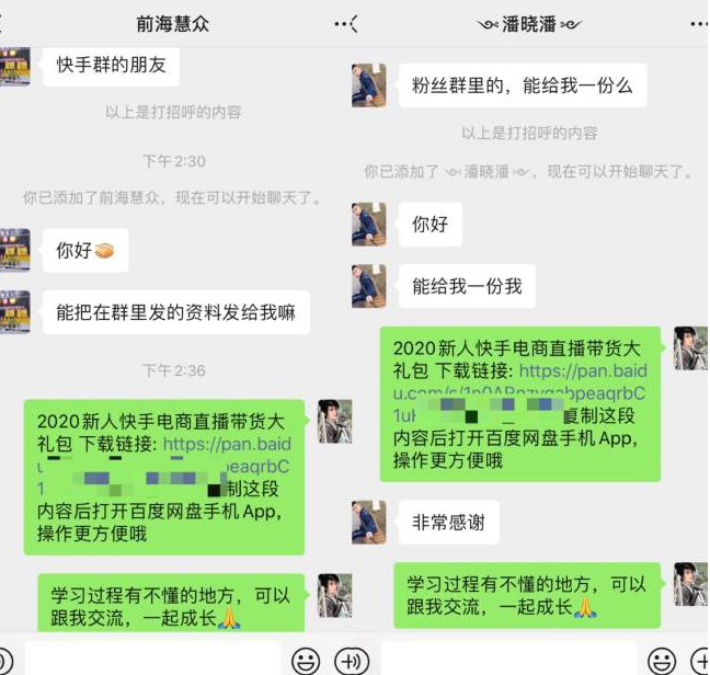 这个就更简单了,直接简单粗暴的送资料,这个群是交流什么的,你就送什么资料,比如这个无花果的群是交流快手电商创业的,那么我就到网上找一套关于《快手电商创业》的课程,然后包装一下,截个图,丢到群里,配上一段诱饵话术,搞定!