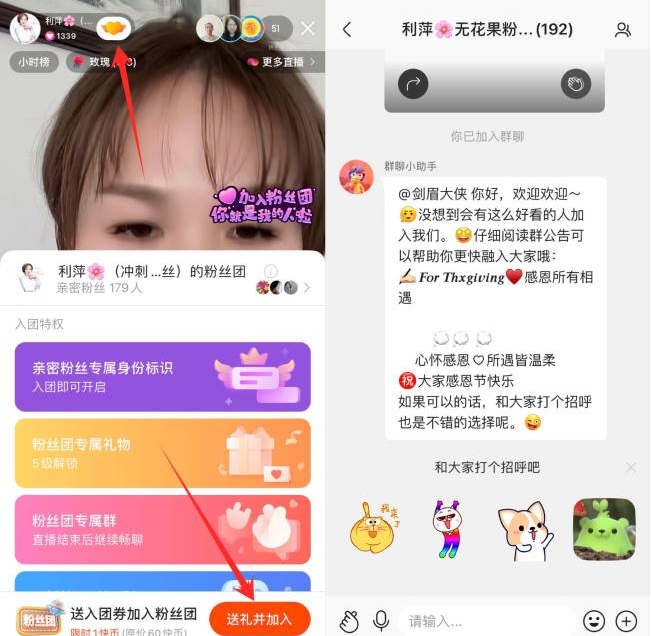 很简单,批量进入这些无花果的直播间,左上角有个加入粉丝团的图案,点击一下,然后右下角有个【送礼并加入】,限时1快币,这成本低到可以忽略不计……