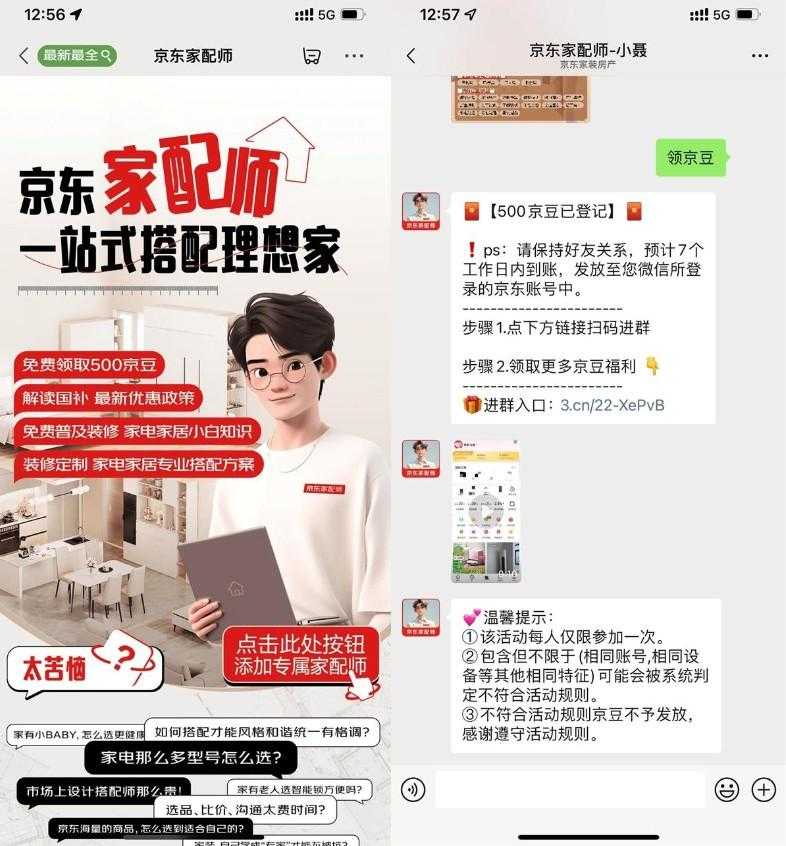 京东搜索“京东家配师”->根据提示添加->回复“领京豆”会自动登记,7天内自动发放500京豆