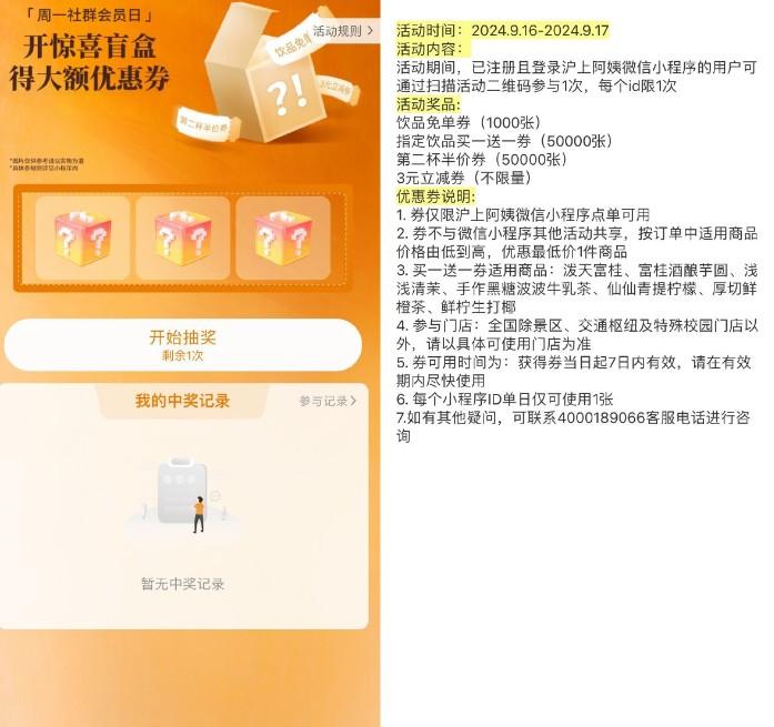 微信打开活动->有1次机会直接抽免单券或买一送一券