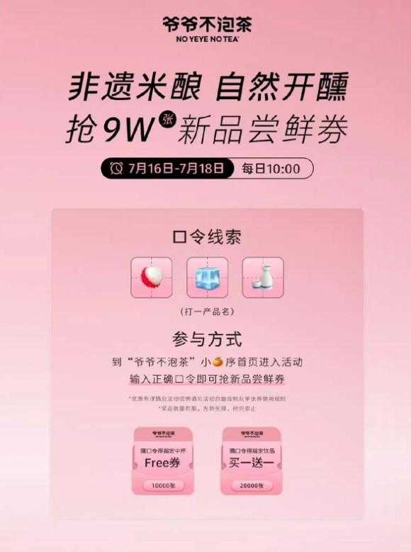 微信进入#小程序:爷爷不泡茶 ->10点整会显示活动入口,输入口令抢1万份免单券或2万张买一送一券