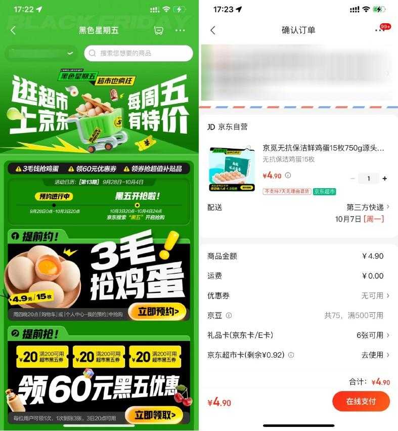 京东APP搜索“周五神价888”->指定时间抢10-9亓券,可以买鸡蛋、卷纸等等