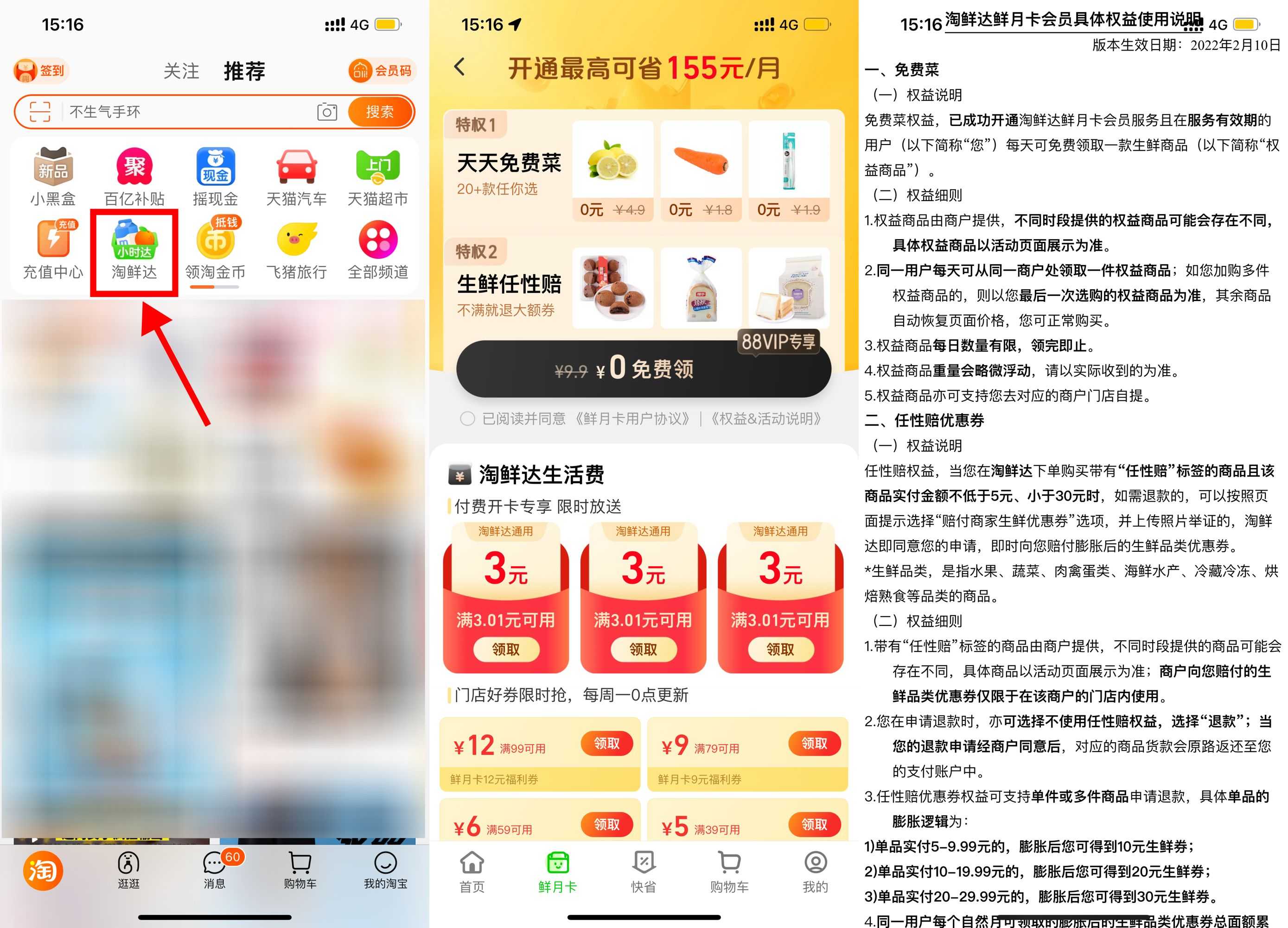 限88VIP参与!淘宝首页“淘鲜达”->底部“鲜月卡”->直接0元开通即可