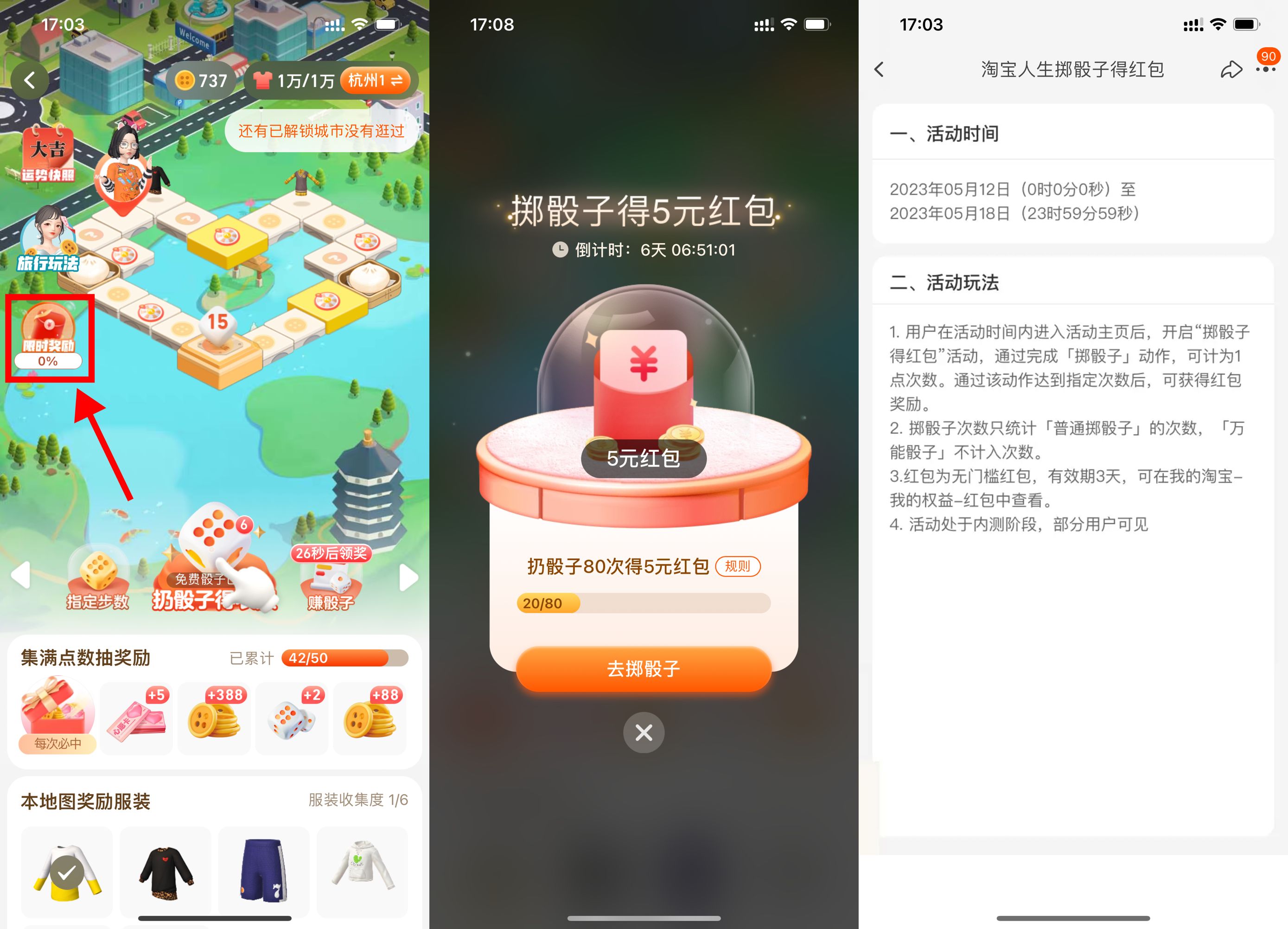 淘宝APP搜索“淘宝人生”->点击“去逛街”->左侧“限时奖励”->简单浏览得骰子并扔出,大概4天就能满80次,领5元通用购物红包