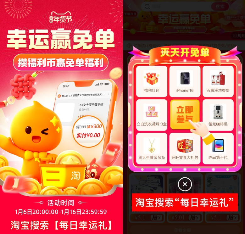 淘宝搜索【每日幸运礼】每天进入可抽红包或实物!攒福利币最高得300亓免单!