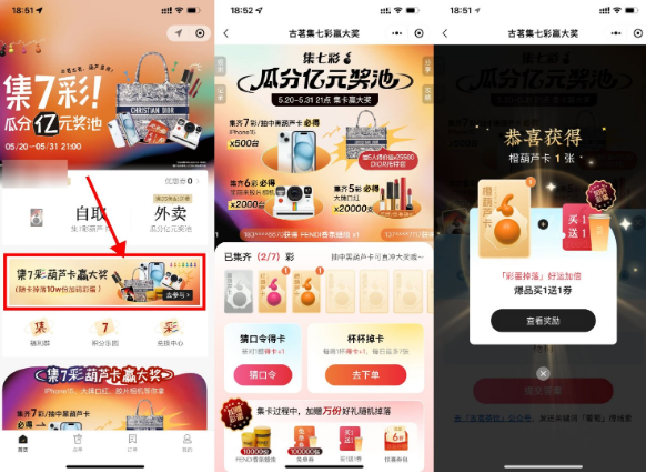微信进入#小程序:古茗茶饮点单 ->集7彩葫芦卡->每天输口令得葫芦卡+随机抽免单券、实物、买一送一券,集齐5~7彩必得图2的实物