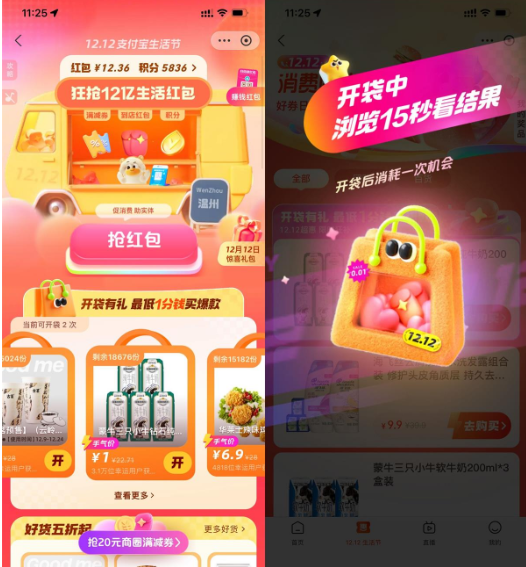 支付宝搜索“1212”->先选择自己想要的再点“开”->浏览15秒开袋抽1元实物