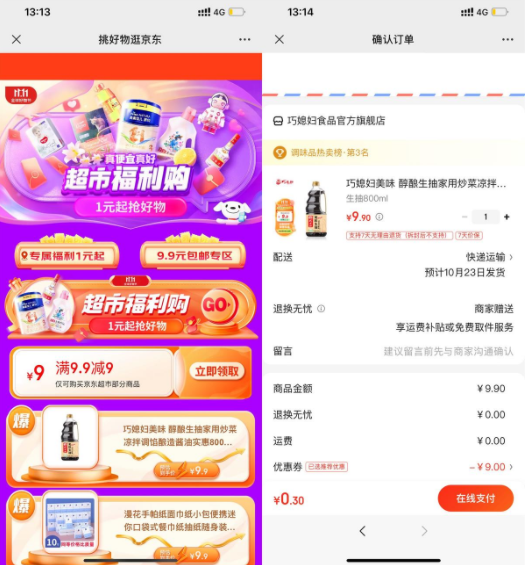 打开地址->领9.9减9元券->0.9元撸实物包邮