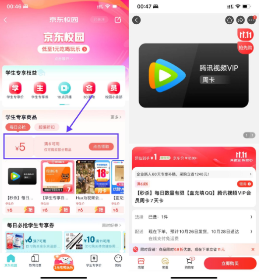 京东APP搜索“京东校园”->领6减5元券->可1元买腾讯视频/优酷周卡或永和大王套餐