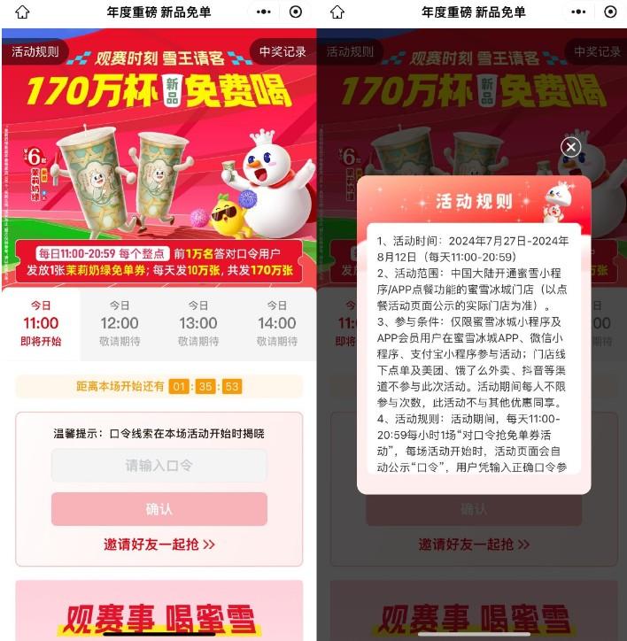 活动将在今天11点开始,持续17天到8月12日结束!每个整点1万张茉莉奶绿免单券