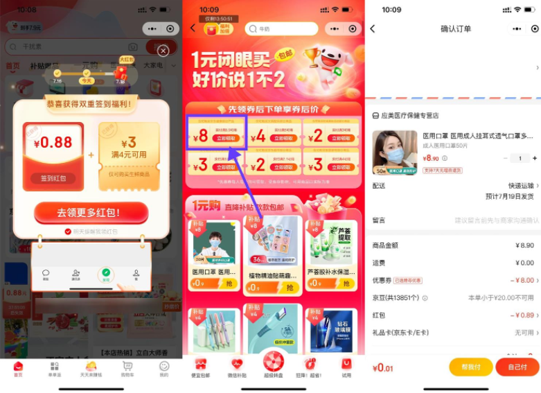 微信底部“发现”->点击“购物”进入->自动弹出签到红包->顶部“1元购”领取“8.9减8元券”任选一个8.9元的实物,抵扣券+红包后最低0.01元到手