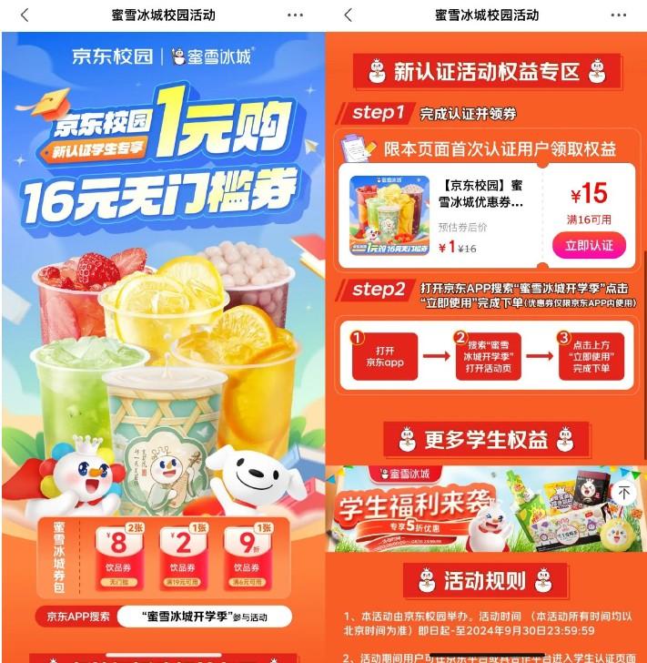 京东APP搜索“蜜雪冰城开学季”->新认证学生用户领16亓无门槛券,可1亓喝蜜雪冰城