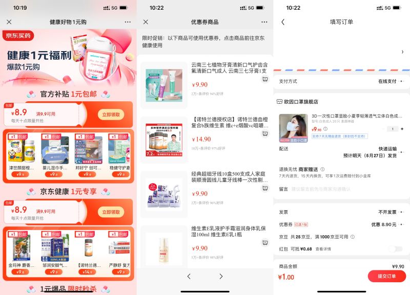 打开领券地址领9.9减8.9元券->任选一个9.9元的东西下单,跳转到京东健康APP,自动抵扣8.9亓券1元包邮到手