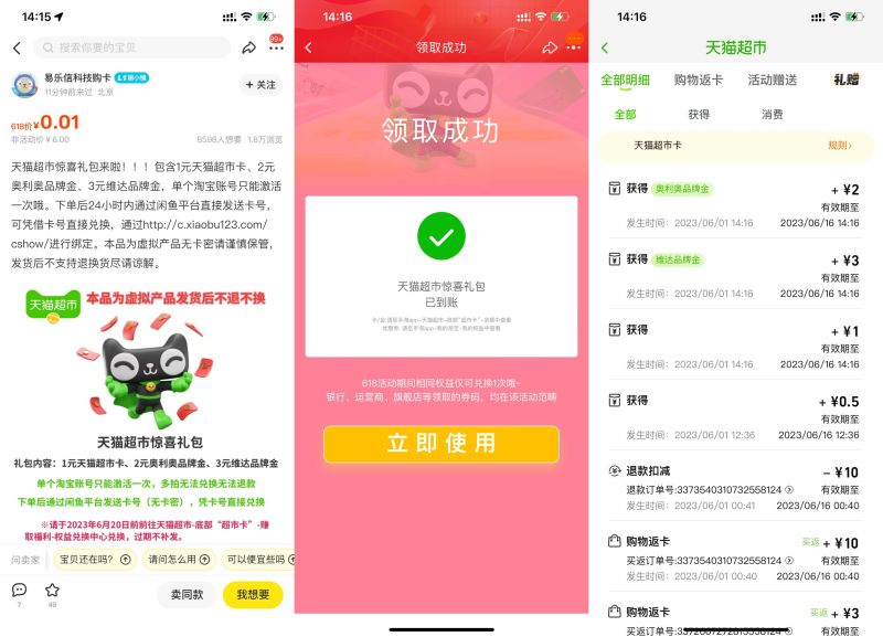 咸鱼APP扫码->0.01元直接买->复制兑换码->在“淘宝APP-天猫超市-超市卡-赚卡福利-权益兑换中心”粘贴兑换