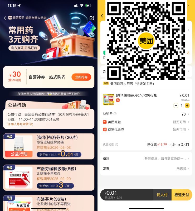 美团扫码或微信打开->每天11点~11点30分0.01元抢布洛芬20片包邮,每天限量1万份先到先得