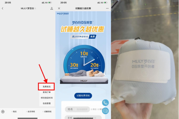 微信关注公众号“MLILY梦百合”->菜单栏“试睡领枕”->预约时间到店试睡10分钟领梦百合定制枕头,全国门店均可参与!