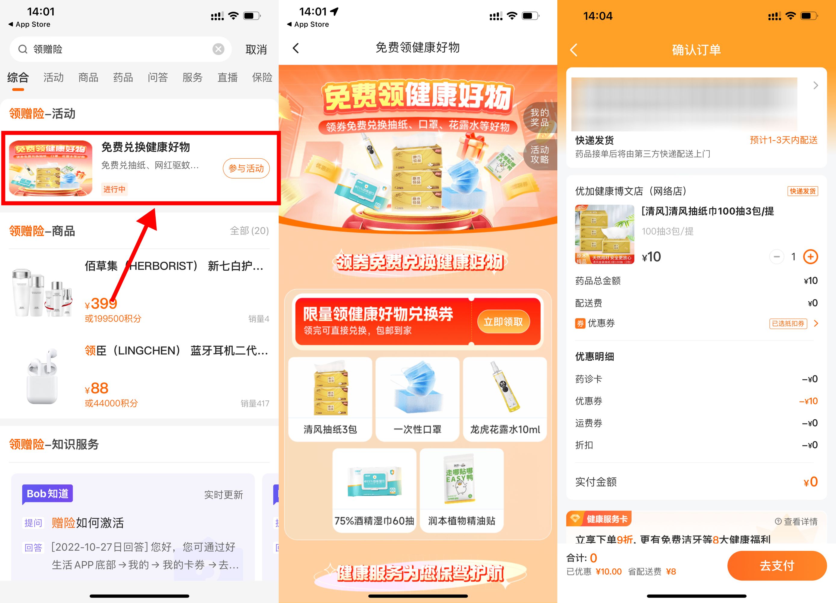 平安好生活APP->首页左上角设置“深圳”->搜索“领赠险”进入->0亓领个保险然后返回页面领五选一实物->在“我的-我的卡券”中激活使用即可