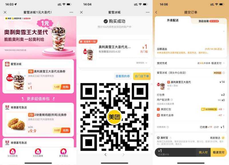 限美团会员参与!打开链接1元买蜜雪冰城圣代1个,然后美团外卖随便找家蜜雪冰城店点2个圣代,美团会员的5元红包兑换蜜雪冰城8元外卖红包,最后再付1亓即可免配送费送到家