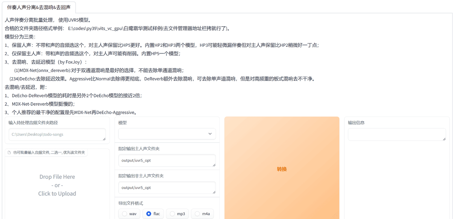 2.在弹出来的界面中输入输入待处理音频文件夹路径,或者直接把你的音频文件拖进去,之后选择模型,这一步我们正常情况下选择HP2,如果音频文件有和声就选择HP5,导出文件格式可以选择wav或者flac,然后点击转换,速度的话3060处理40分钟音频耗时4分钟,转换完成之后还要继续处理,把分离好的人声文件再次拖进来选择“onnx_dereverb”模型来去混响,之后再把去好混响的音频文件拖进来选择“DeEcho-Aggressive”来去延迟,这样你就得到了一份处理的比较完美干净的纯人声音频文件了,这个纯人声音频文件的文件夹路径为GPT-SoVITS-beta\output\uvr5_opt