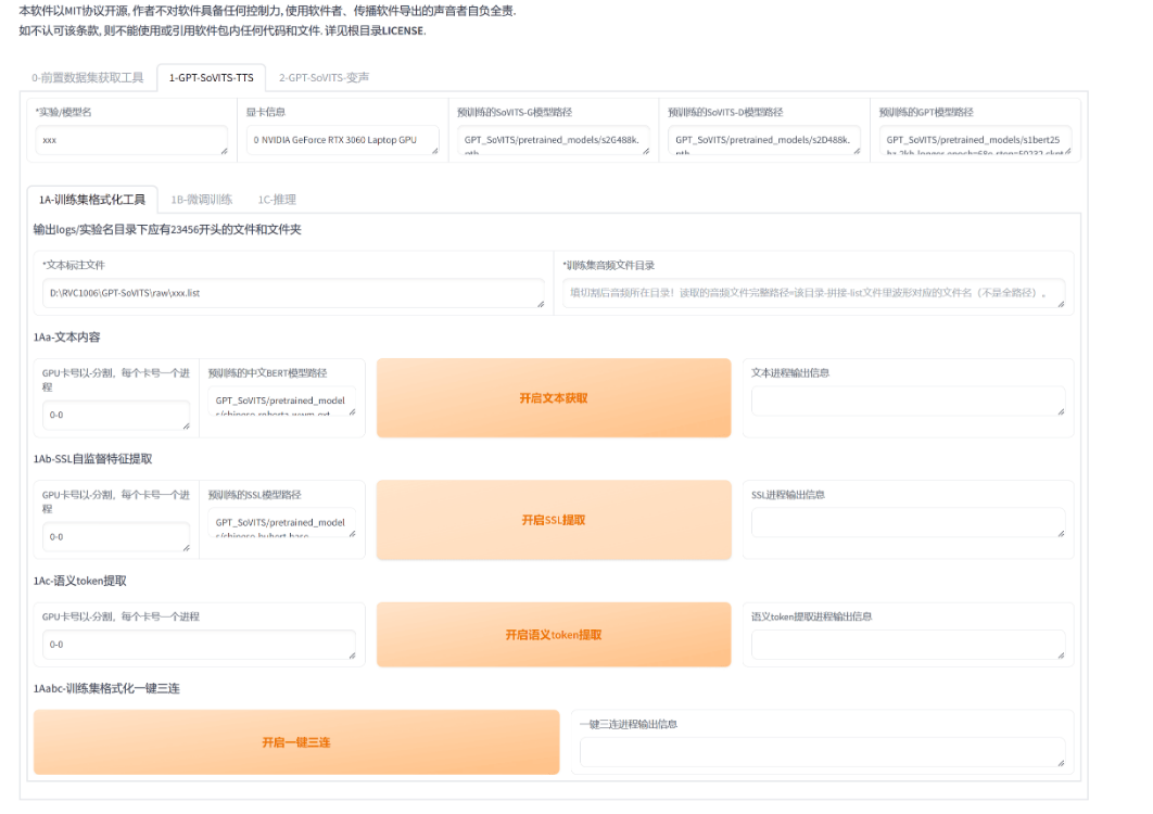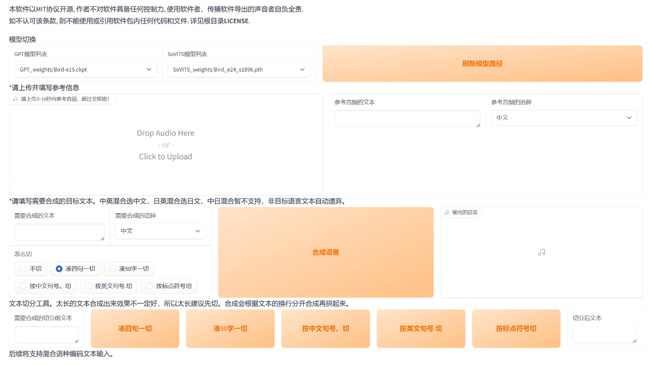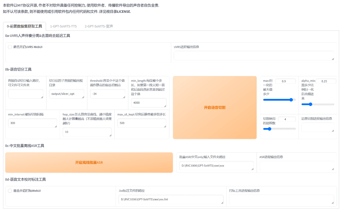 WebUI 工具:集成工具包括声音伴奏分离、自动训练集分割、中文自动语音识别(ASR)和文本标注,协助初学者创建训练数据集和 GPT/SoVITS 模型。