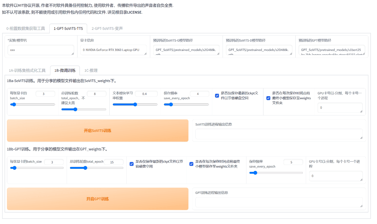 1B. 这里又要敲黑板了,这个也是重点部分,这个步骤就是训练,训练过程分为SoVITS训练和GPT训练,其中SoVITS比较慢,它的轮数不建议设置过多,多了容易出现过拟合现象,导致电音什么的,至于GPT训练,这个蛮快的,也不用训练太多轮,特别要注意的就是每张显卡的batch_size值,这个值是按照你的显卡显存/2来算的,比如6G的显存这里就推荐填3,至于怎么看显存,文章开头就告诉你了,都填好之后,先点击"开启SoVITS训练",训练完成后再点击"开启GPT训练",控制台可以看到进度,报错了请调低batch_size值,这个值也不是越高越好的,两次训练都完成了就进行最后一步了