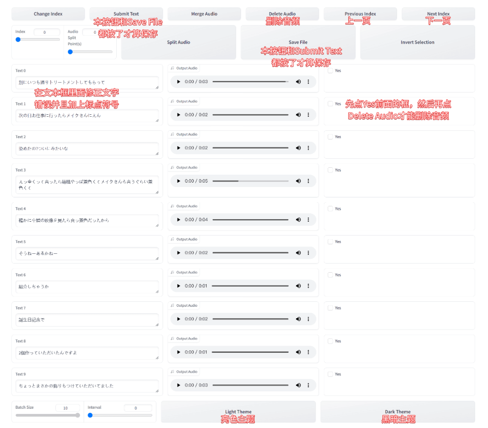 3.在修正完第一个界面的句子之后请先保存,然后再点击右上角的"Next Index"按钮到下一页继续进行修正以及删除,如果想回到上一页点击"Previous Index"按钮就行,如果想切换为黑色主题,点击界面最下方的"Dark Theme"按钮就行,全部修正并且保存完成之后就能进行下一步了,进行下一步之前,记得先把框框里面的勾去掉,修正完成的文件一般都保存在GPT-SoVITS-beta\output\asr_opt下 PS:打标过程请记住一个原则:宁缺毋滥,不要把有噪音,有笑声的片段留着不删除,这种片段极其有可能导致你训练结果很不好看