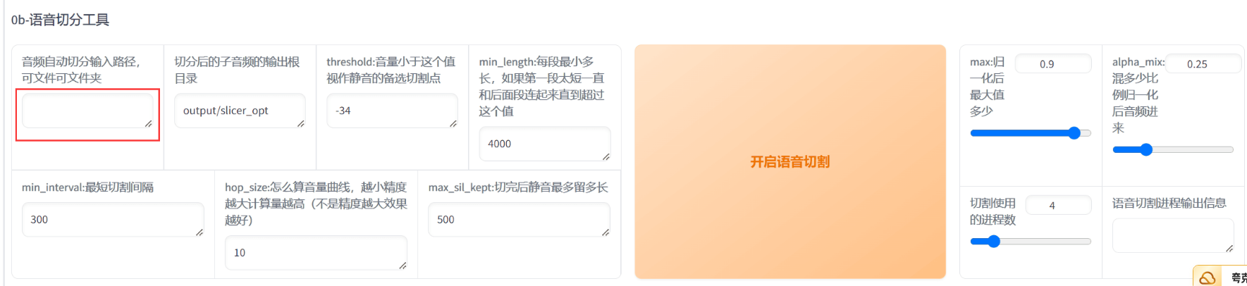 0b. 此时先取消刚刚勾上的框框,不然UVR5网页会一直占用内存,之后在红色框框里面输入你处理好或者准备好的纯人声音频文件的文件夹路径。此时如果你要训练的是中文或者英语那你直接点击开启语音分割就行,如果是日语请把每段最小时长调整为5000(日语长一点比较好,显卡好可以调到10000),之后也是点击开启语音分割,在控制台可以看到进度,这个步骤很快,切分好的文件的文件夹路径为GPT-SoVITS-beta\output\slicer_opt